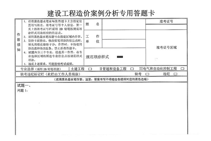关于2015年度造价工程师执业资格考试《建设工程造价案例分析》专用答题卡的说明